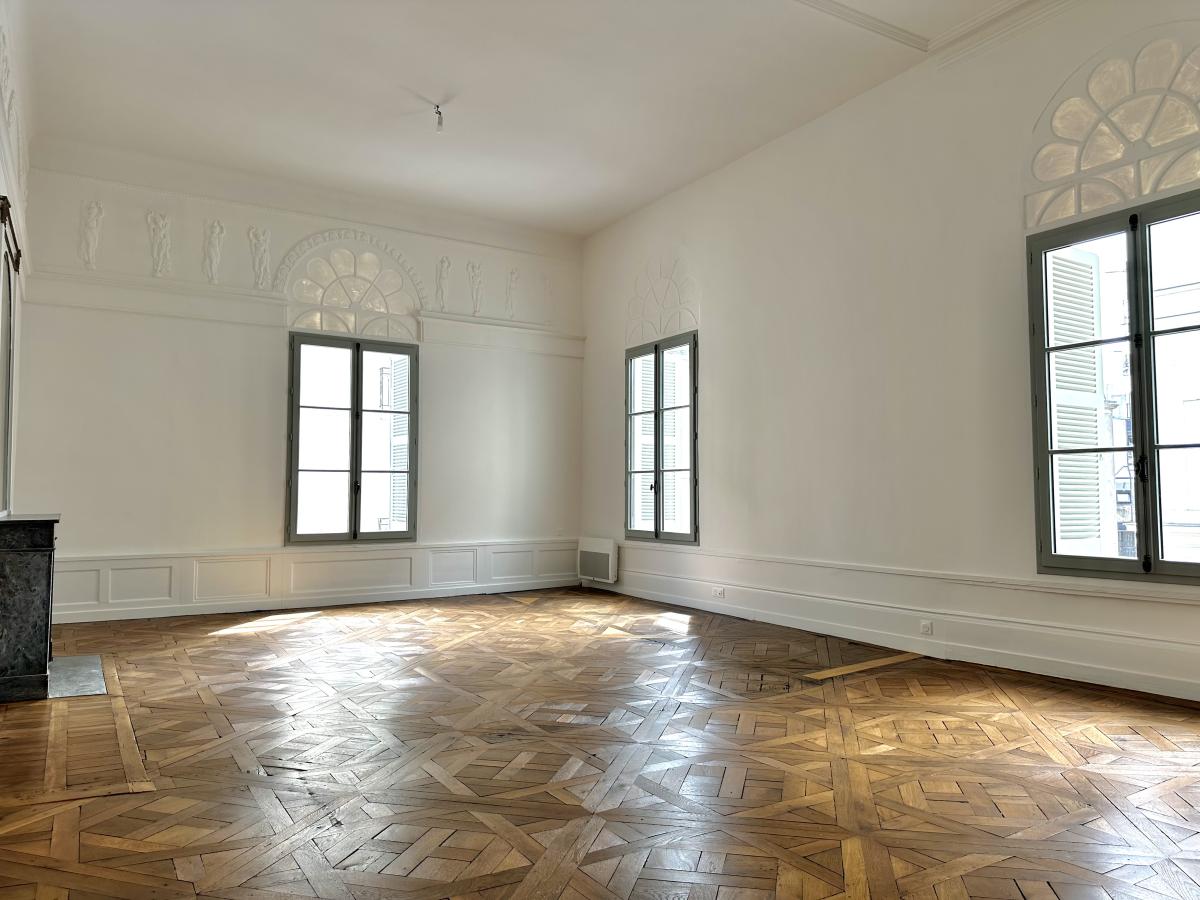 Nantes Graslin – Situé au premier étage avec ascenseur d’un immeuble de caractère classé monument historique bordant le Cours Cambronne, cet appartement d’environ 113m² (125m² au sol) entièrement rénové vous propose :