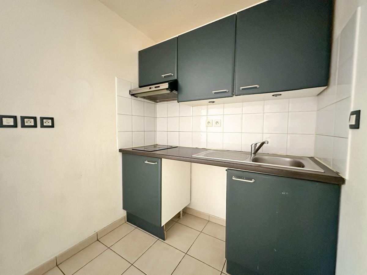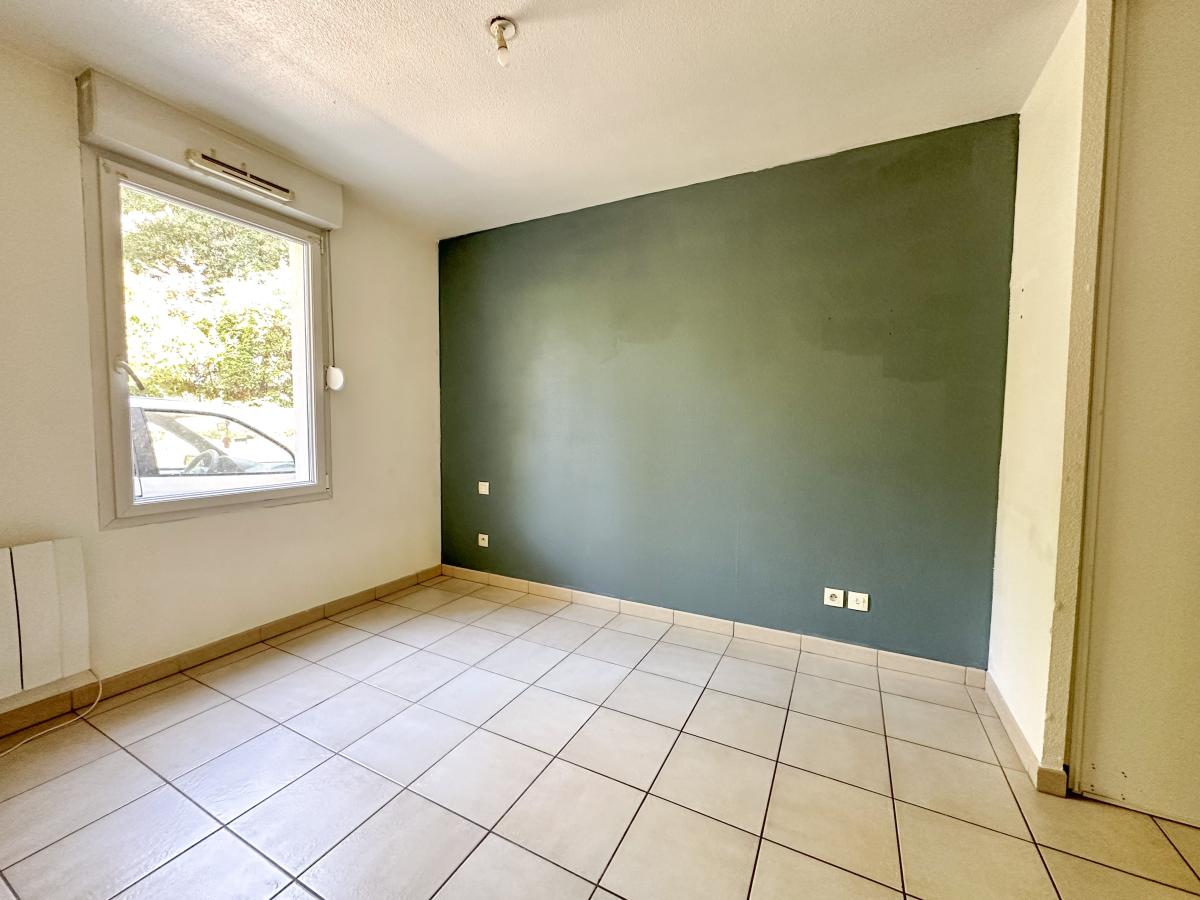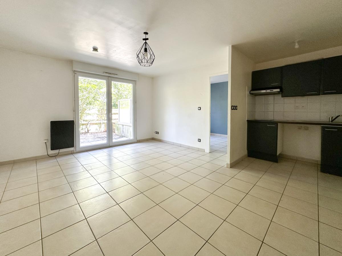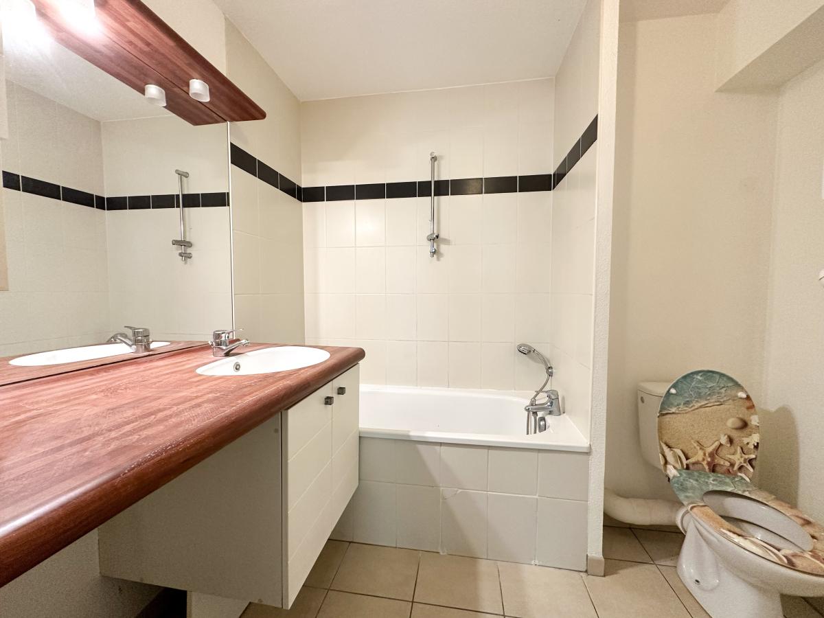 Une entrée avec placards, une pièce de vie d’environ 22m² avec cuisine équipée et donnant sur sa terrasse, une chambre d’environ 11m² avec placard et salle de bains attenante comprenant baignoire, vasque et WC.