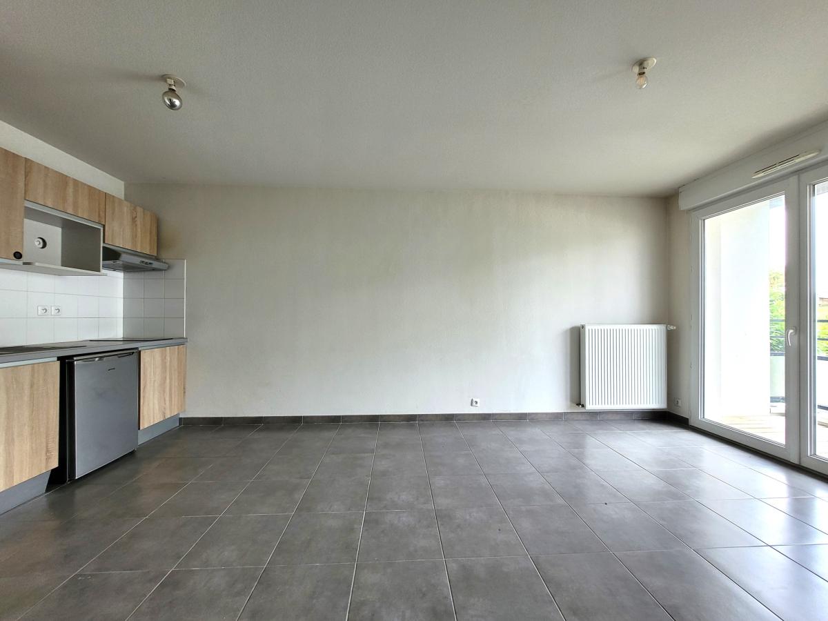 Une entrée avec placard, une pièce de vie lumineuse avec cuisine ouverte et balcon exposé EST, une chambre avec placard, et une salle de bains avec WC.