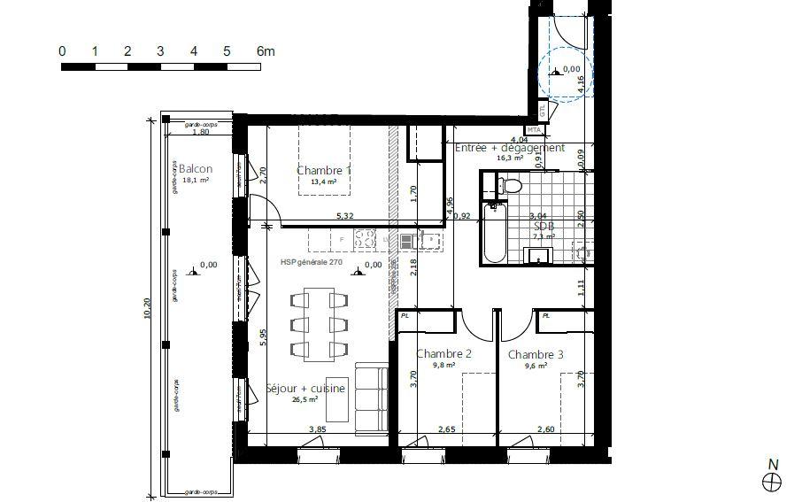 Entrée avec placards, pièce de vie d’environ 26.5m² avec cuisine ouverte et donnant sur son balcon d’environ 18m² exposé Sud-Ouest, 3 chambres, dégagement, salle de bains avec baignoire, vasque et WC.