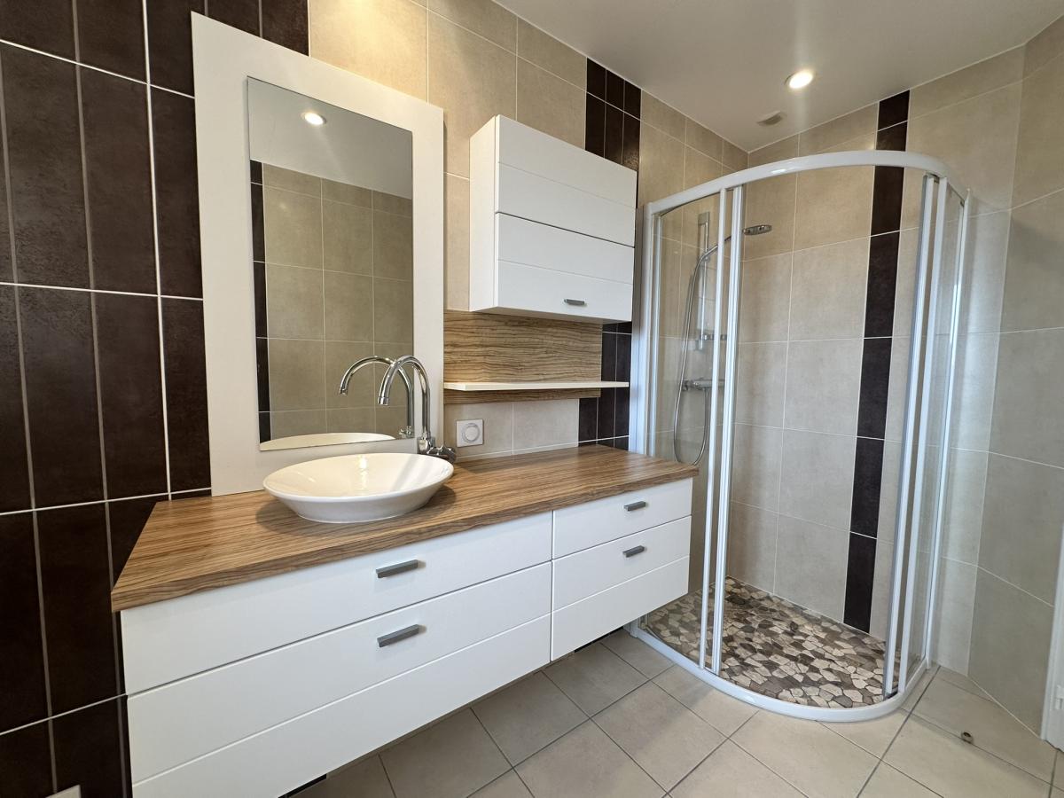 À l’étage : une pièce palière avec placards, trois chambres dont deux avec balcon, une salle d’eau avec douche et vasque, ainsi que des WC séparés.
