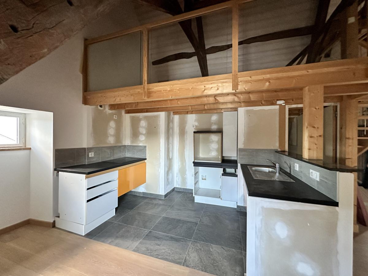 Au deuxième étage : un appartement type loft d’environ 80 m² comprenant une cuisine aménagée ouverte sur la pièce de vie, une salle d’eau, un WC indépendant et un coin nuit en mezzanine.