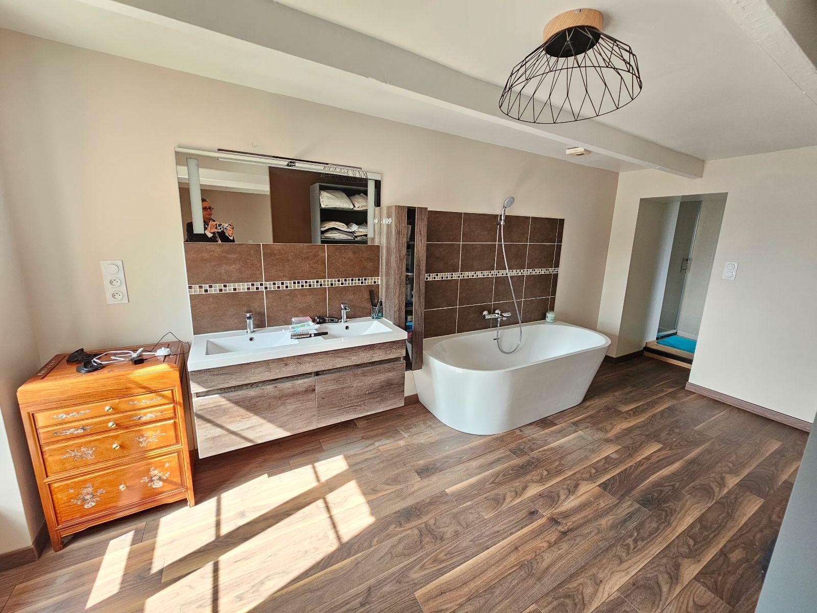 Saint Benoît des Ondes avec mer et commerces à proximité, ensemble de deux maisons d’habitation. Une est en location (loyer 1060e/mois), elle comprend : un salon/séjour, dégagement avec placard donnant sur wc, cuisine aménagée et équipée, salle d’eau, chambre, et à l’étage : un palier, une suite parentale comprenant une grande chambre avec baignoire, wc salle d’eau, et deux pièces faisant office de chambre. Véranda d’environ 20m2 .L’autre maison : cuisine aménagée et équipée ouverte sur salon séjour (mezzanine au dessus), salle d’eau avec wc, et à l’étage, palier, deux chambres avec placards dont une avec baignoire. Garage. Ces deux biens disposent de terrasse extérieure, jardin, et emplacement de stationnement. Le tout sur terrain de 1569m2, constructible.