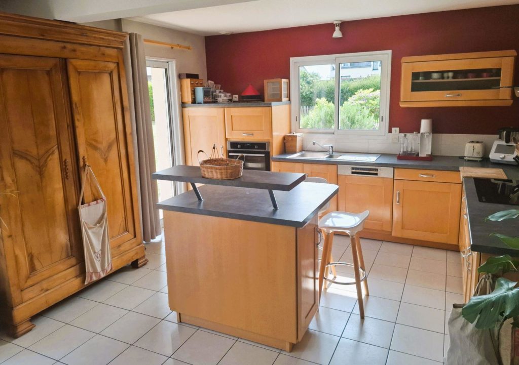 Saint-Coulomb, proche plage, maison de 2005, composée au rez-de-chaussée : d’une entrée, cuisine aménagée et équipée ouverte sur séjour donnant sur salon avec poêle à bois, une chambre, salle d’eau, wc, et à l’étage : une mezzanine desservant trois chambres, dressing, salle de bains avec douche, wc, une pièce grenier.