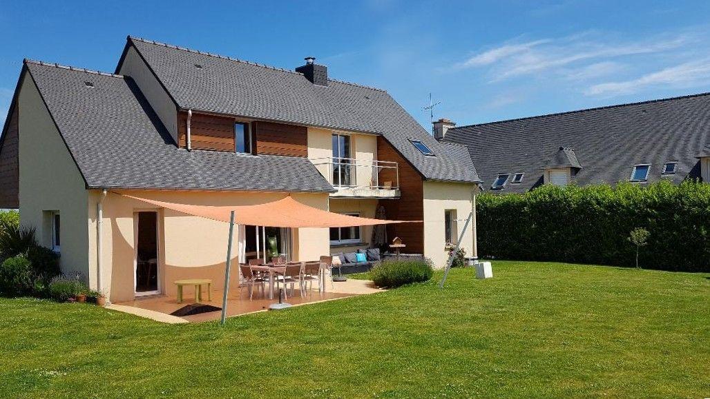 Saint-Coulomb, proche plage, maison de 2005, composée au rez-de-chaussée : d’une entrée, cuisine aménagée et équipée ouverte sur séjour donnant sur salon avec poêle à bois, une chambre, salle d’eau, wc, et à l’étage : une mezzanine desservant trois chambres, dressing, salle de bains avec douche, wc, une pièce grenier.