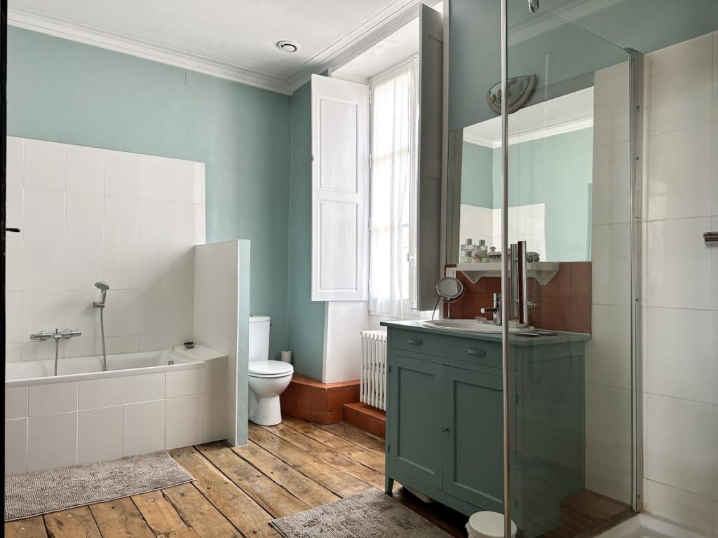 AU 1er ETAGE : Palier, chambre parentale avec cheminée et salle de bains attenante comprenant douche, baignoire et WC, chambre avec cheminée, bureau avec point eau et placards (ancien cabinet de toilettes pouvant devenir une nouvelle SDE ou un dressing…).
