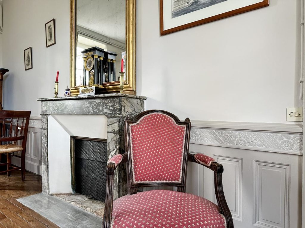 AU RDC : Entrée spacieuse avec bibliothèque, salon et salle à manger sur parquet avec accès jardin, pièce de vie avec cheminée, cuisine aménagée, chambre avec accès jardin, salle d’eau, WC avec lave-mains.
